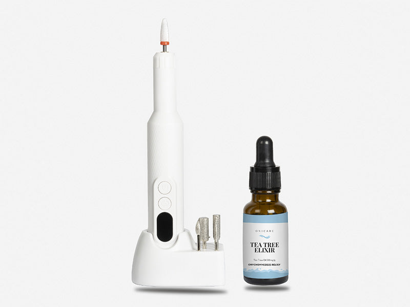 OniCare™ offers a two-fold solution: a toenail grinder to address thickness and discolouration, and elixirs, including Tea Tree Oil, for consistent daily use to combat bacteria and fungi.